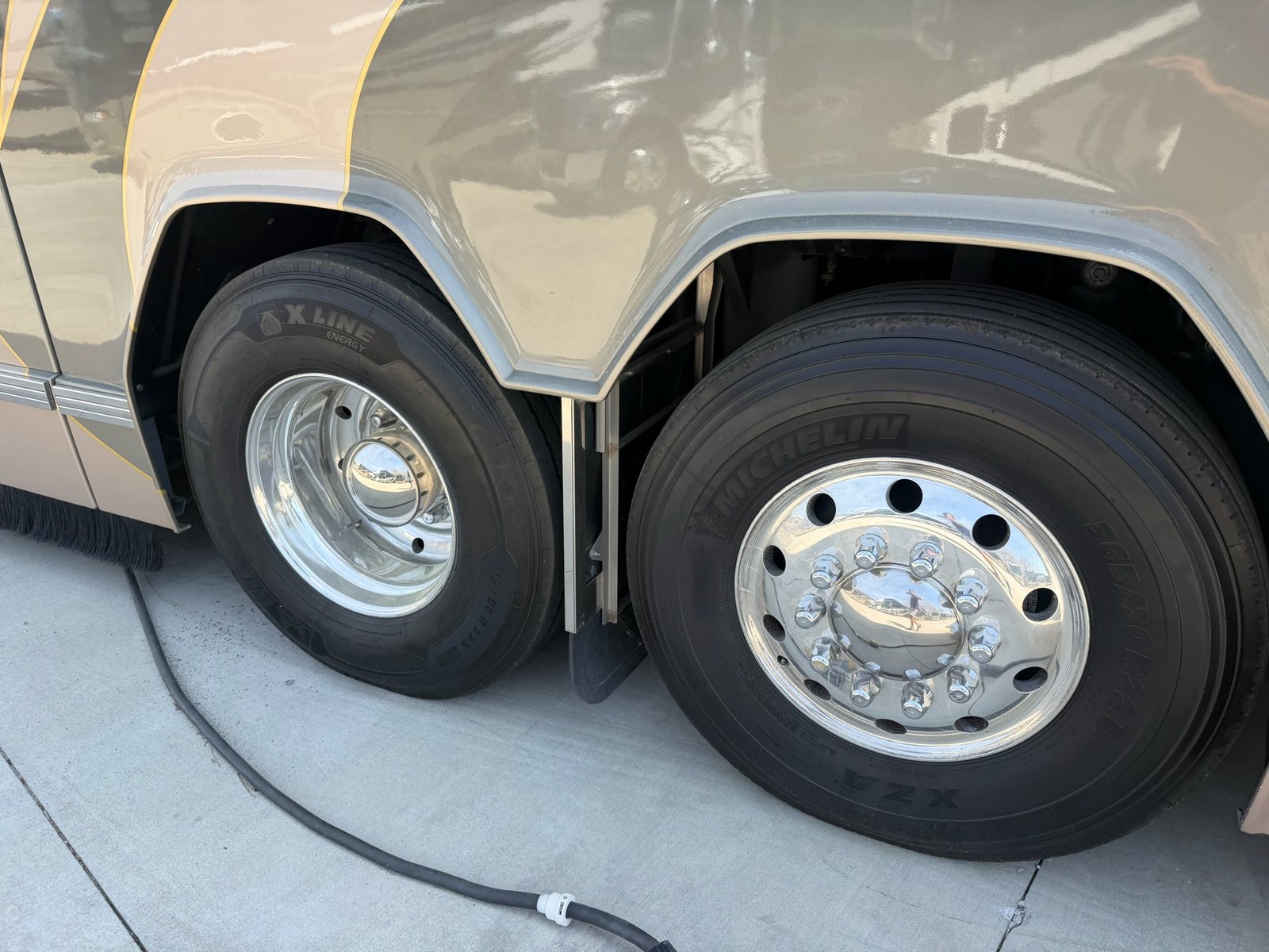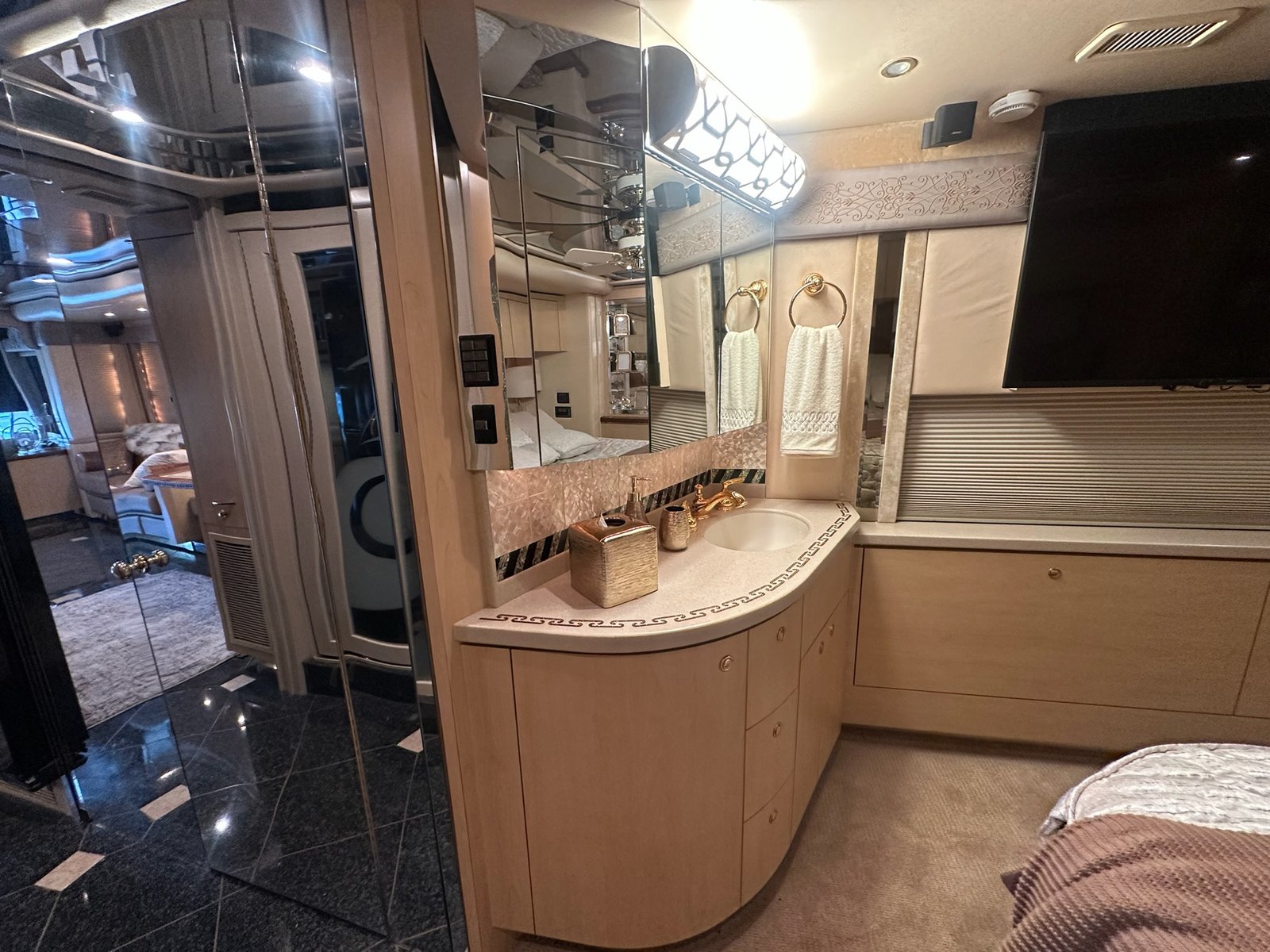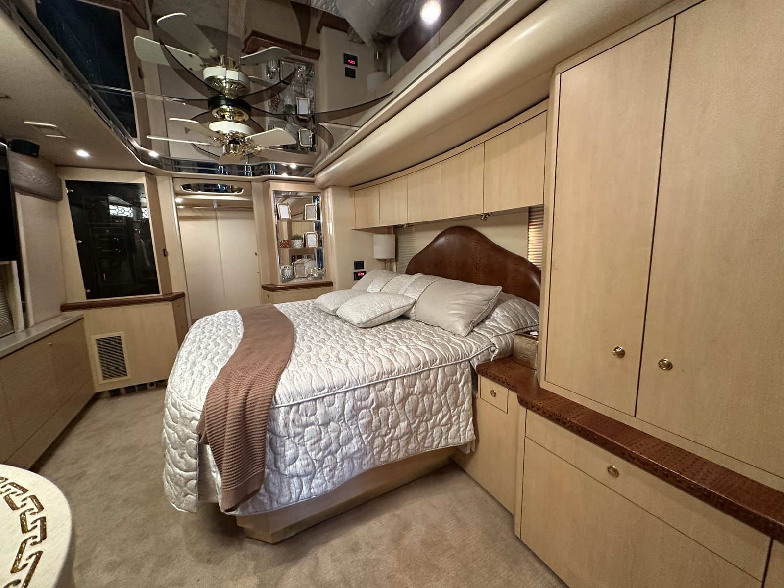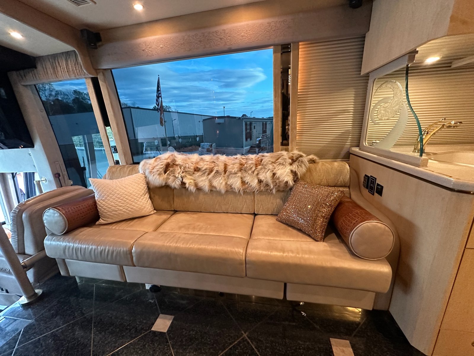 This is absolutely beautiful. Featherlite conversion Bus has low miles and a matching Featherlite aluminum stacker trailer. It’s got a double slide floor plan with leather everywhere in excellent condition, as well as stunning tile flooring and custom grout. Fiber optic accent lights and a custom tiled shower.