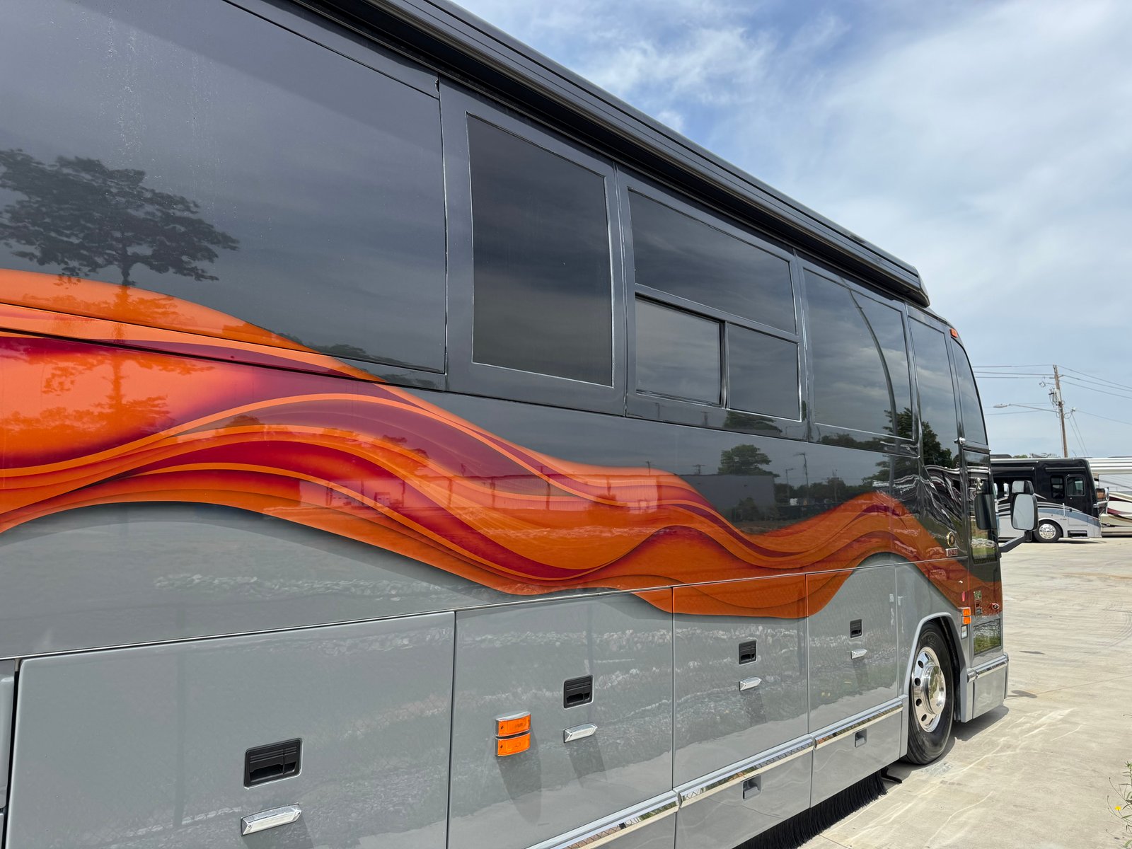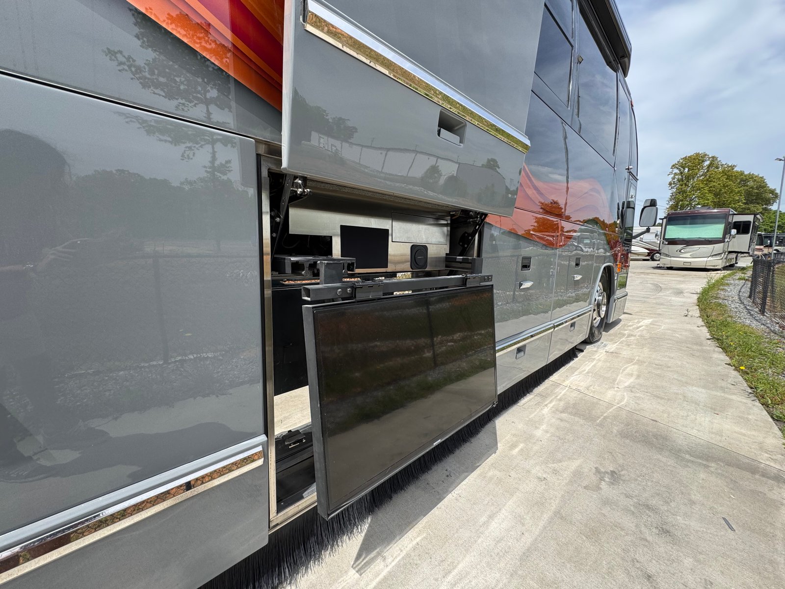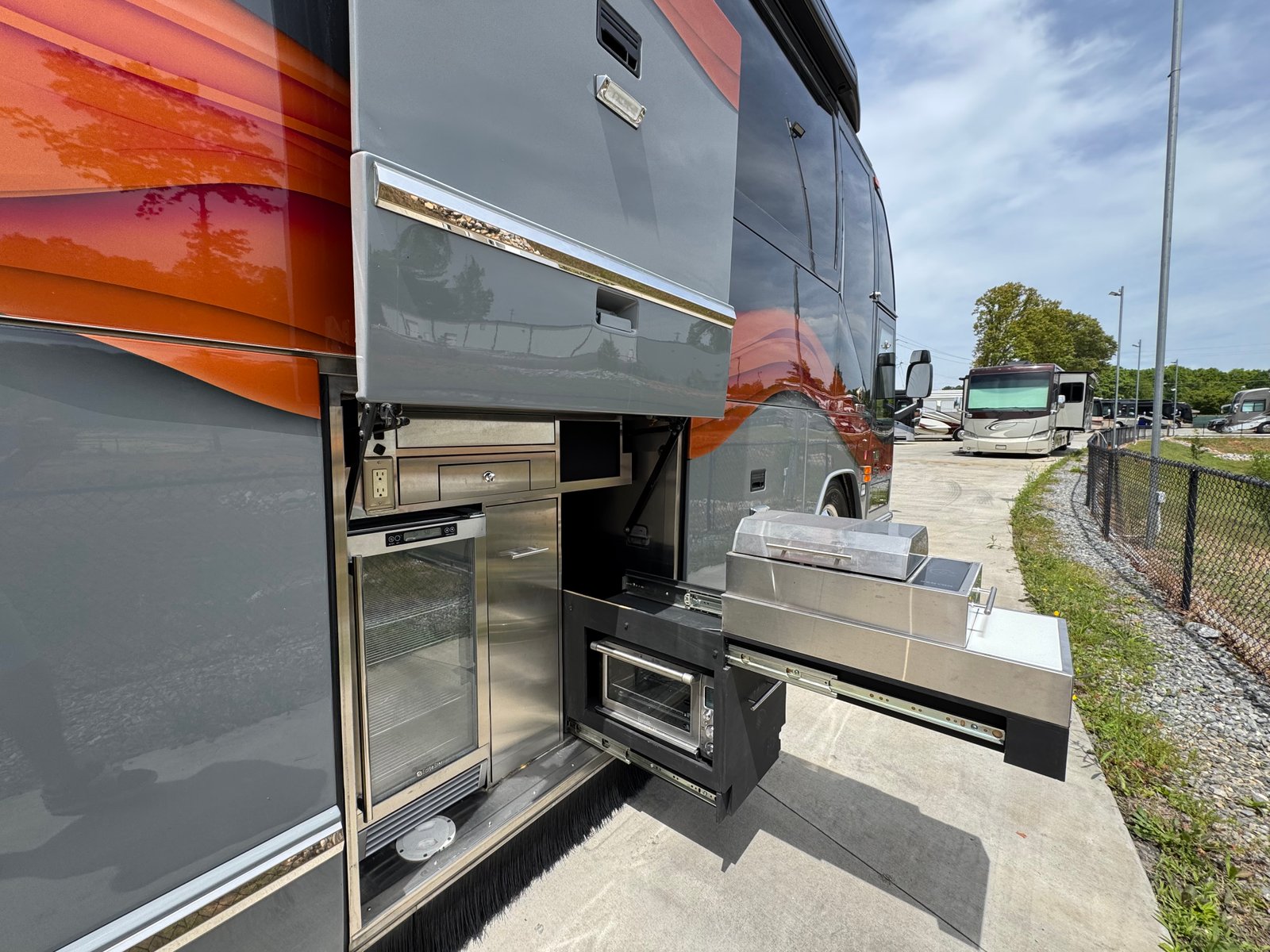This coach has a number of updates to it. With a nice outside entertainment center, including a TV, a grill, a small Dutch oven and a refrigerator. The coach has a 2024 paint job that looks incredible. With new LED lights on the exterior, the coach shines inside and out.