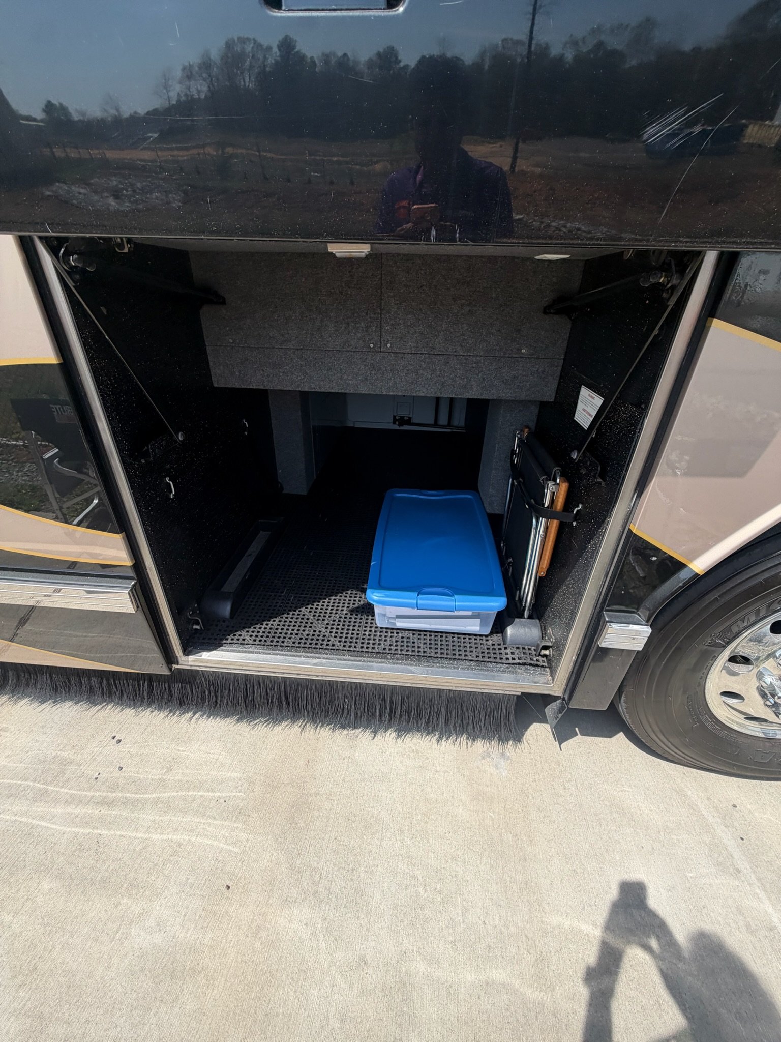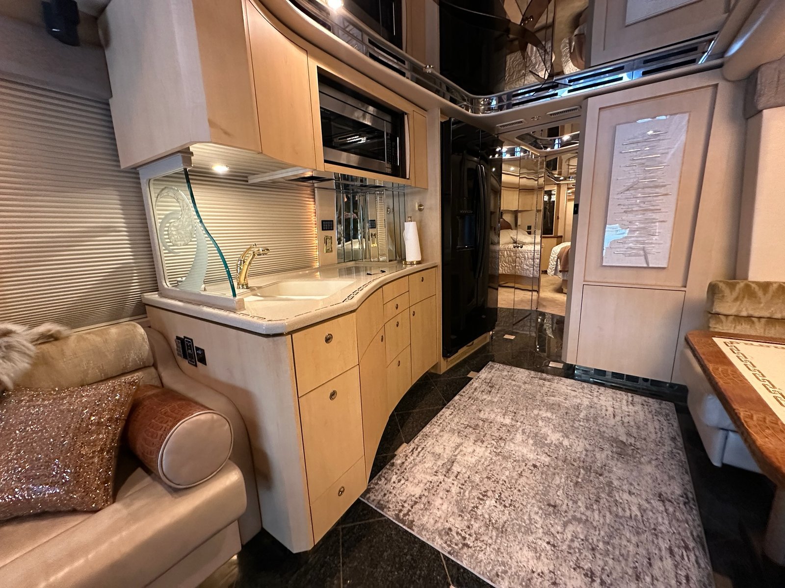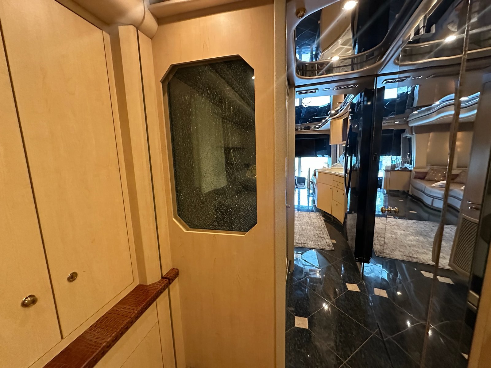 This is absolutely beautiful. Featherlite conversion Bus has low miles and a matching Featherlite aluminum stacker trailer. It’s got a double slide floor plan with leather everywhere in excellent condition, as well as stunning tile flooring and custom grout. Fiber optic accent lights and a custom tiled shower.