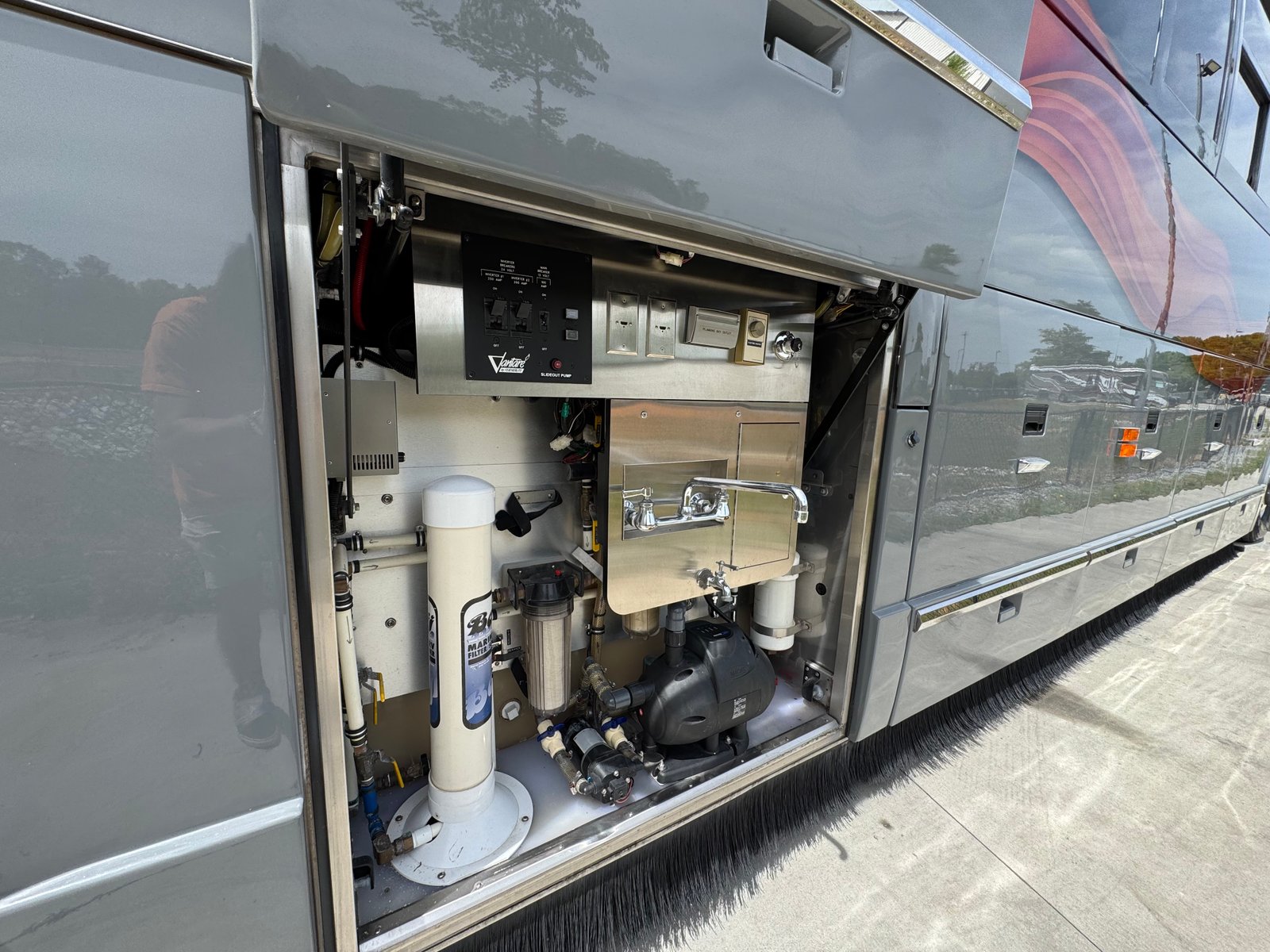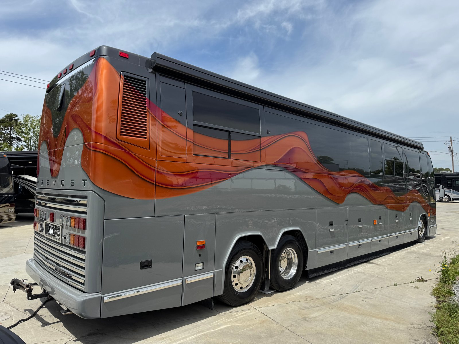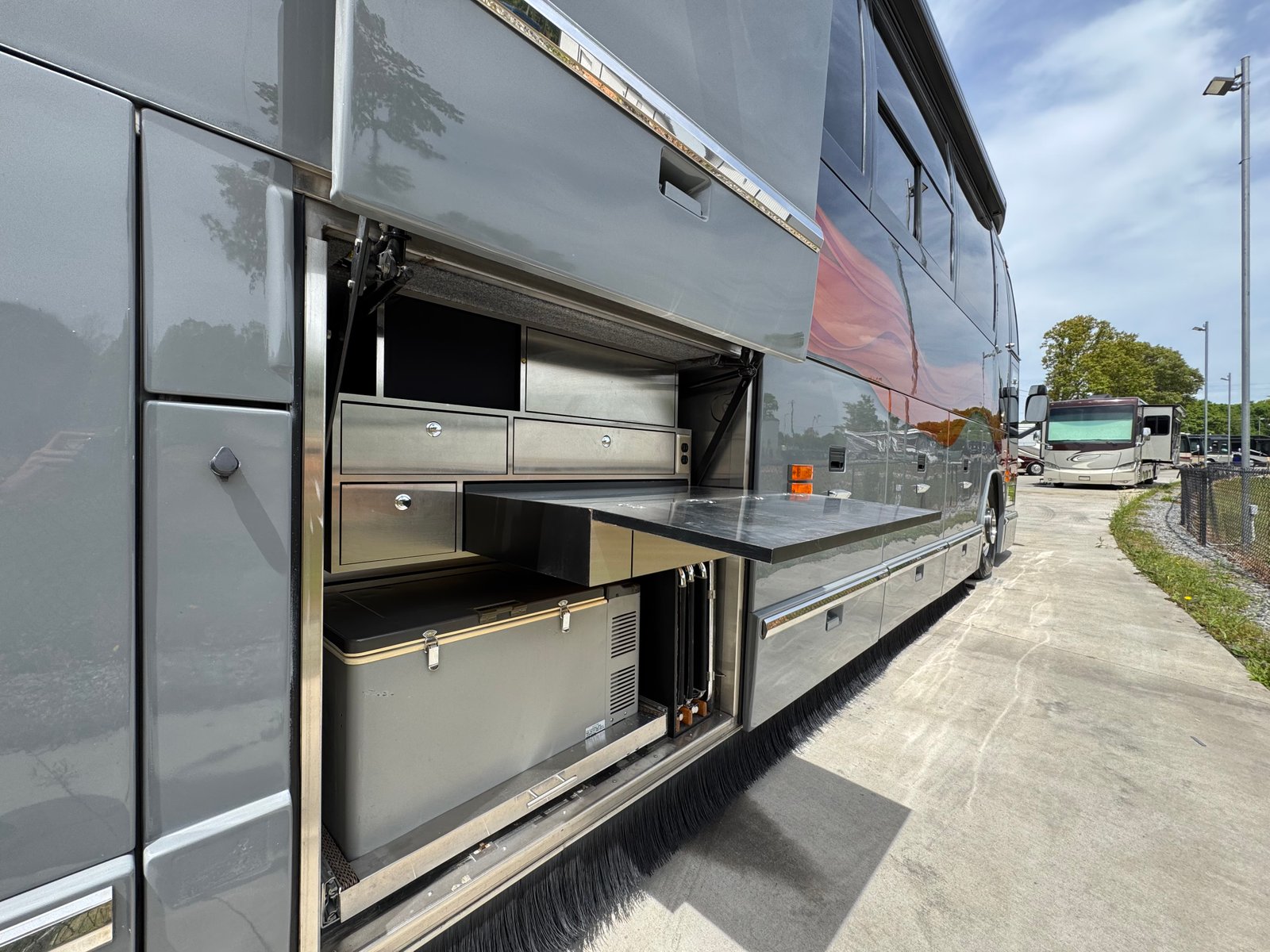 This coach has a number of updates to it. With a nice outside entertainment center, including a TV, a grill, a small Dutch oven and a refrigerator. The coach has a 2024 paint job that looks incredible. With new LED lights on the exterior, the coach shines inside and out.